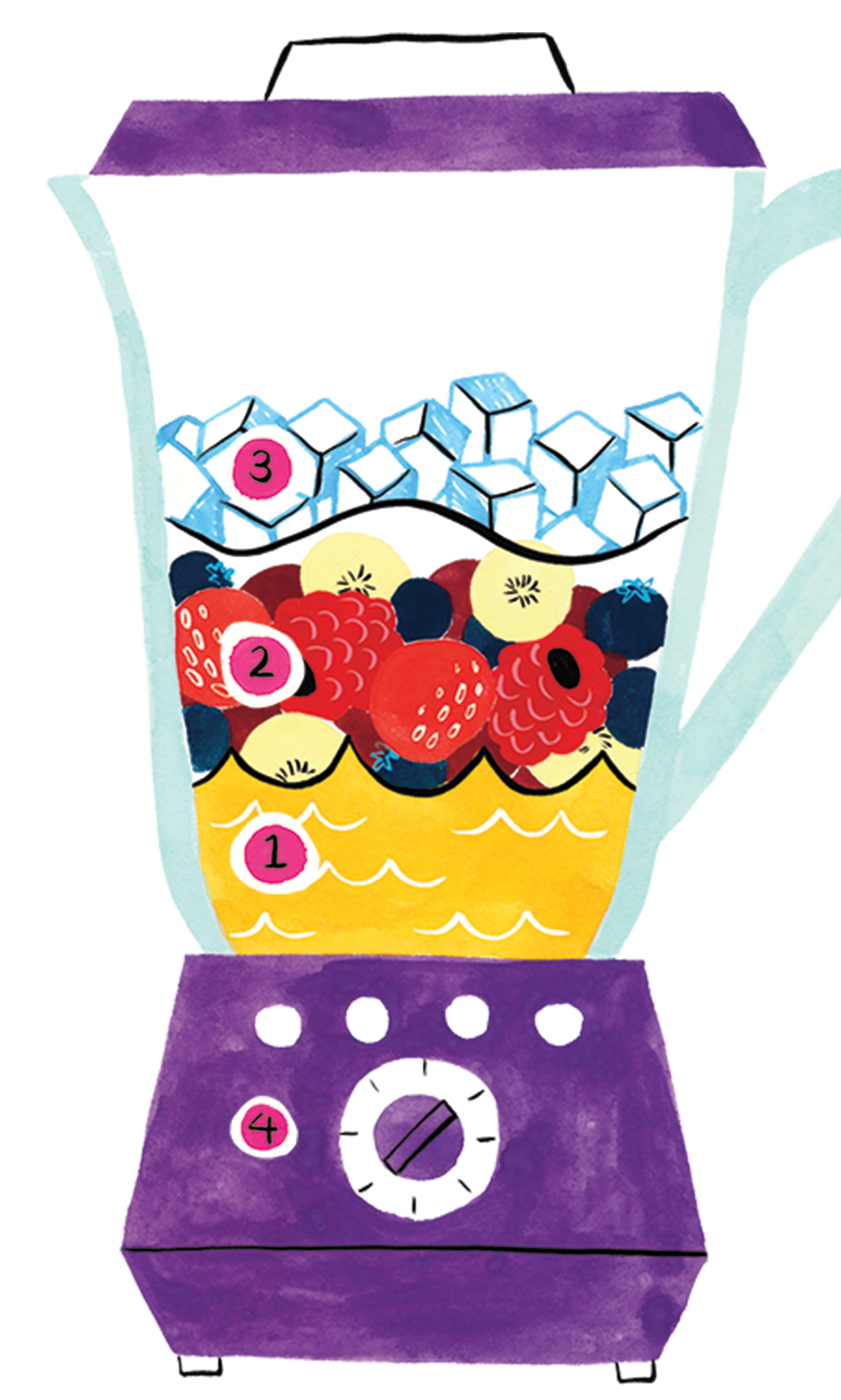 3. Finish with any frozen ingredients such as frozen fruit or ice.
