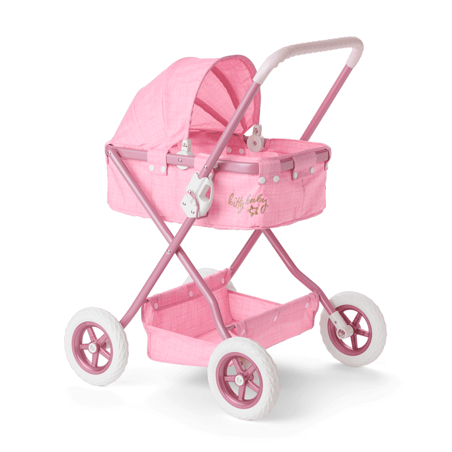 It’s time to take Bitty Baby on a walk in this stroller that’s big enough for two—perfect for one Baby or two! It has a pink metallic frame that holds a pink printed bassinet lined with plush fabric for a soft and sweet landing place. Open and close the canopy for a bit of sun or shade, and store all of Baby’s necessities in the caddy underneath. The stroller folds flat for storage.