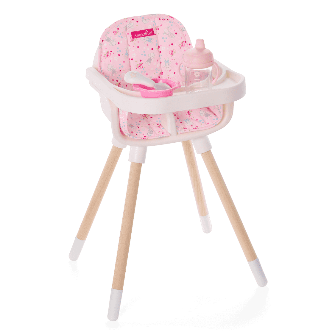 • A sleek Scandinavian-style high chair with wooden legs and non-slip feet. The high chair is designed for little ones to easily place Bitty Baby® in and out of the seat.