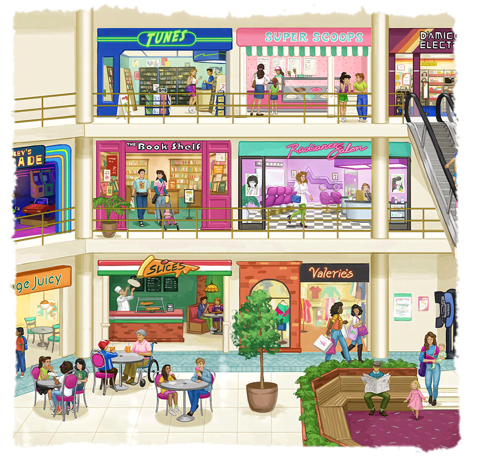 Smartphones and social media didn’t exist in the 1980s, so kids often went to the mall to see each other.