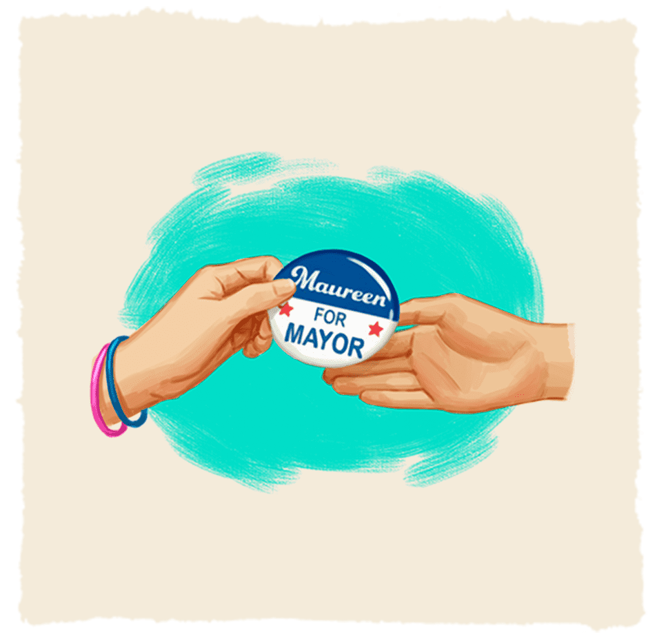 Courtney’s mom juggles a full-time job with caring for her kids, and running for mayor! When a reporter questions Maureen’s ability to be a mayor and a mom, Courtney says, “She can be both!”