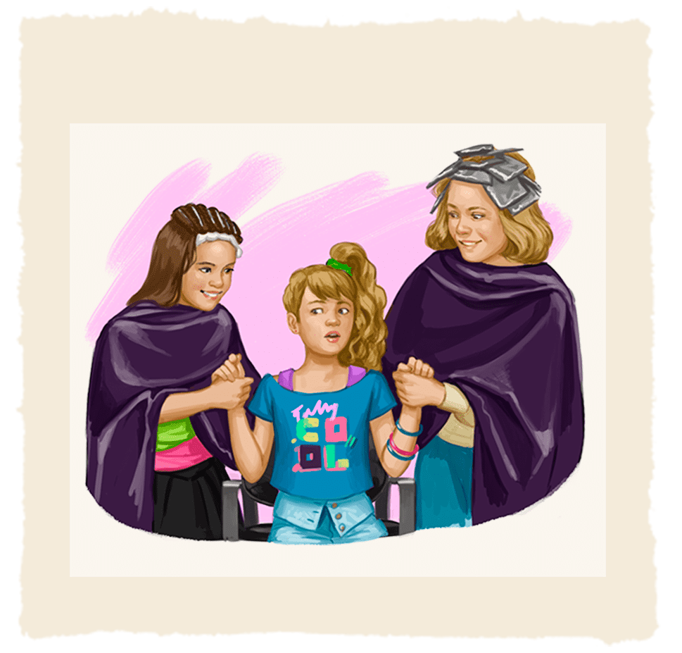 Just like many 1980s girls, Courtney gets a perm at a hair salon. Women and girls wanted sky-high hair and used many products to achieve the look.