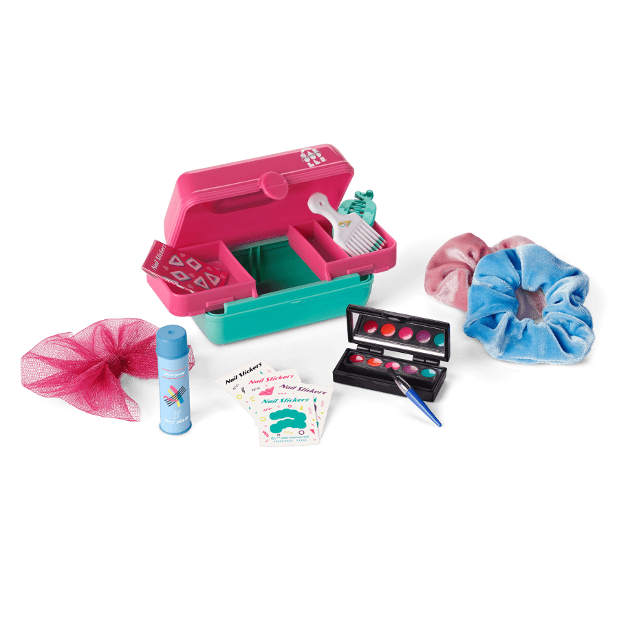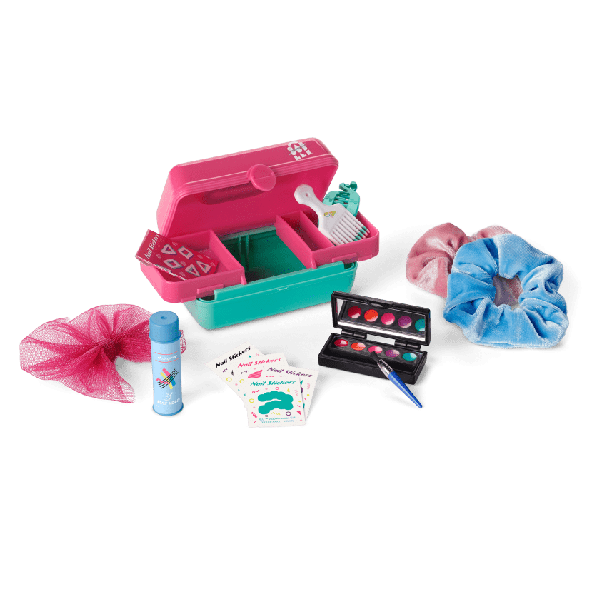 A pink-and-teal Caboodles® beauty case with storage trays that slide out to hold her hair accessories and makeup