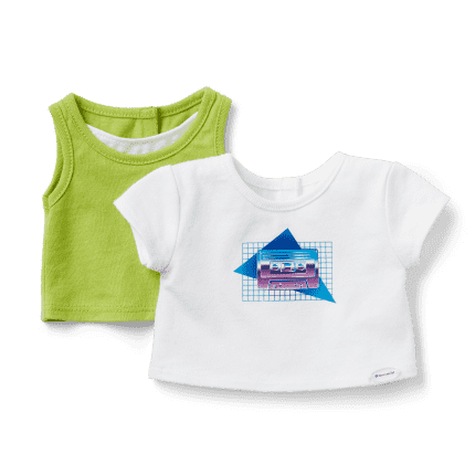 The ’80s were all about the layered look, and this green tank top paired with an oversized white tee is totally tubular. The tee is short-sleeved and has a geometric graphic on the front.