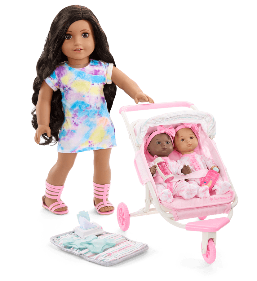 • A pink jogging-style stroller that can hold one or two 7.75-inch Little Bitty Baby™ dolls. It features a retractable striped canopy and a back storage pocket for Baby’s essentials