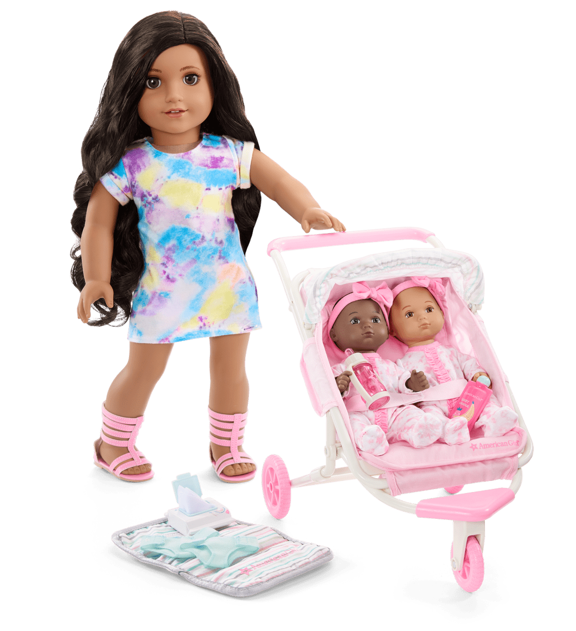 • A striped folding changing pad with a soft rainbow-patterned interior, two diapers, a pretend baby wipe case with three wipes, a pink bottle that Baby and 18-inch dolls can hold, and a pretend container of baby food