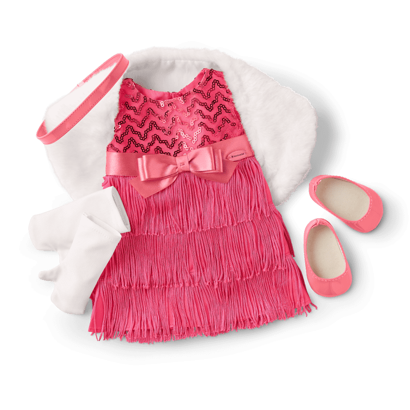 • A pink dress with a sequin bodice and three layers of fringe on the skirt that move when Melody dances