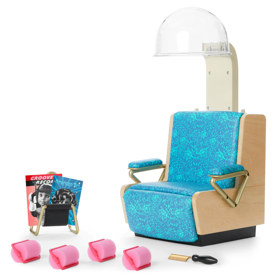 Flash back to vintage vibes and iconic hairstyles with this authentic retro-inspired salon set. Set the scene with this 9-piece playset for 18-inch dolls, designed to pair with the 1960s historical character doll, Melody™; Melody’s™ Salon Outfit; and Melody’s™ Salon Accessories (all sold separately).