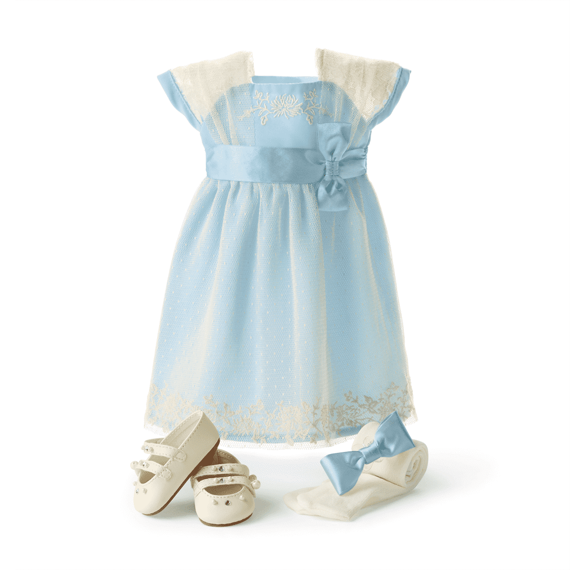 • A blue satin hairbow and pair of cream tights to match