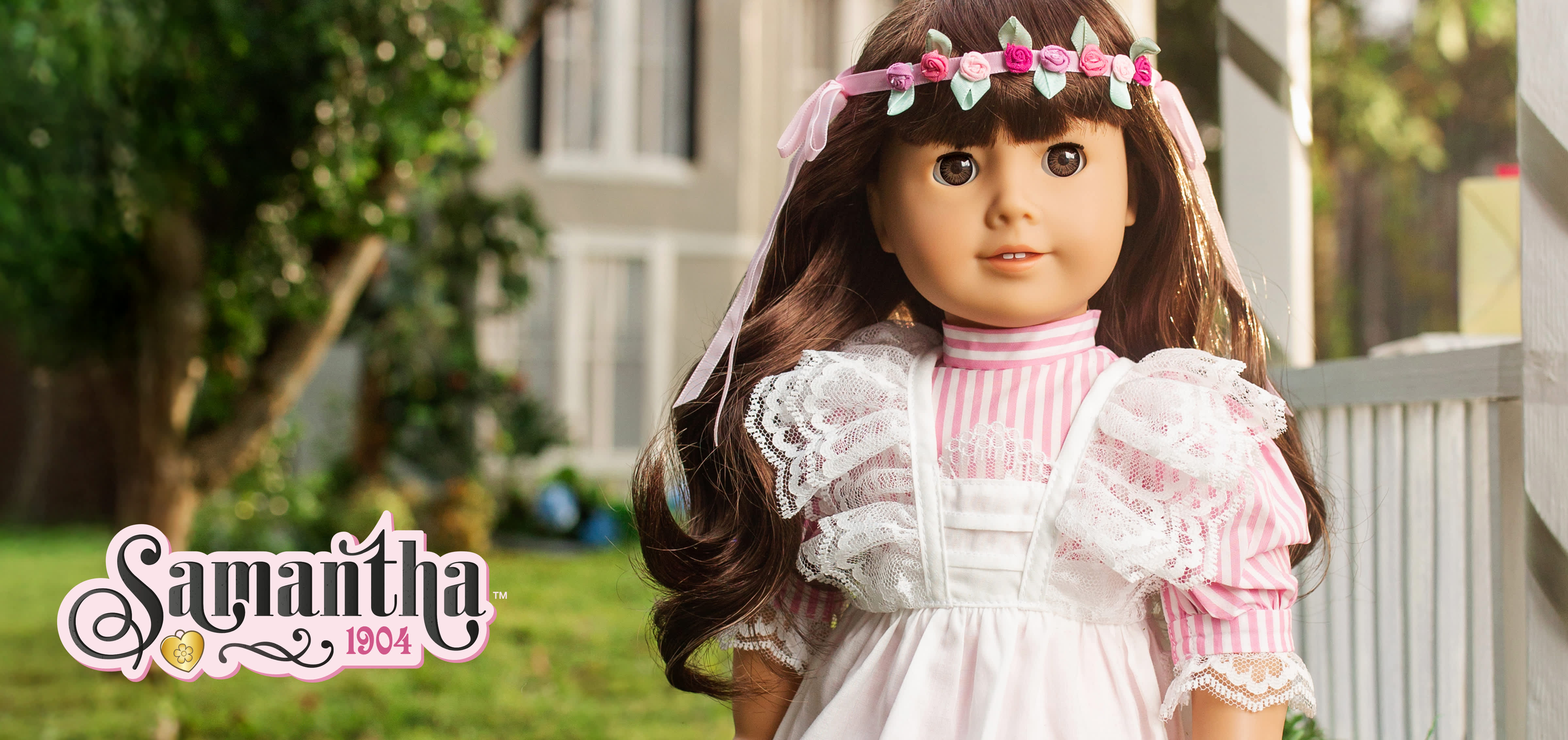 A replica of the original Pinafore Dress & Rosebud Circlet from Samantha’s collection: a rose-and-white-striped taffeta dress covered with a crisp white pinafore that has ruffled lace “bretelles” and a wide sash that ties into a huge bow; white party socks; and Grandmary’s gift, the old-fashioned circlet of rosebuds that once belonged to Samantha’s mother