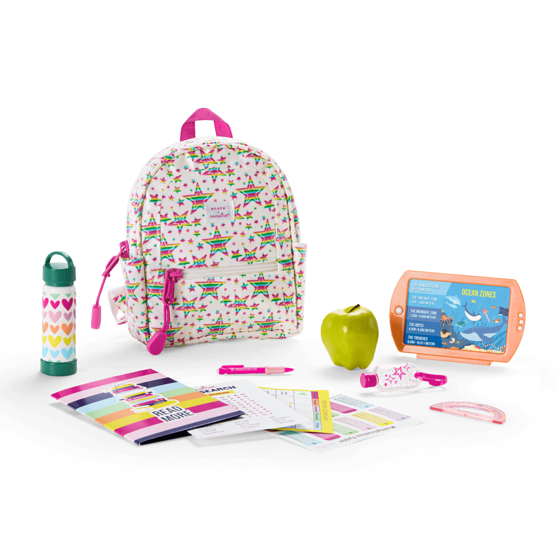 This rainbow star-print American Girl® x STATE Bags backpack features toggled zipper pulls, a logo label, a zippered front pocket, and padded shoulder straps with webbing straps layered on top. Accessories fit in the zippered main pocket, and the side pockets are designed to hold the heart-print water bottle.