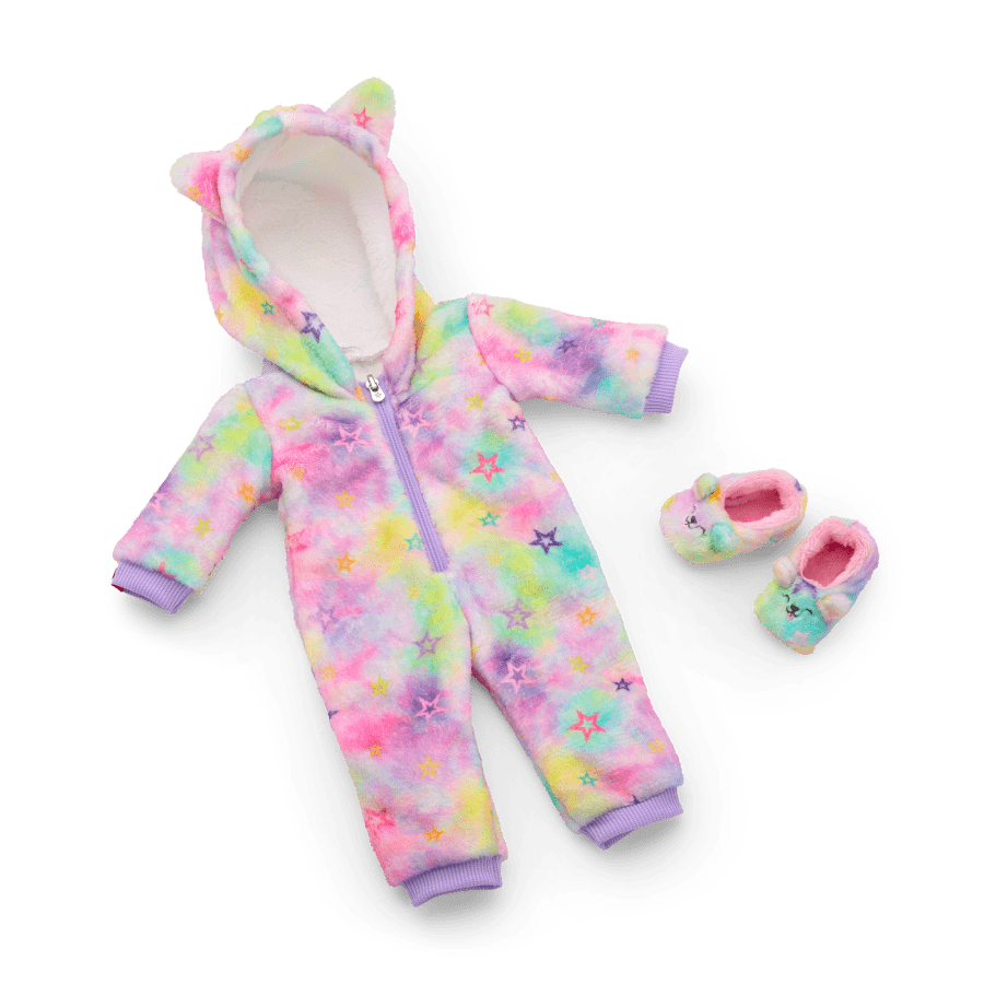 A one-piece pajama bodysuit with animal ears on the hood, an allover pastel rainbow pattern with colorful AG™ stars, a purple zipper, and rib-knit cuffs