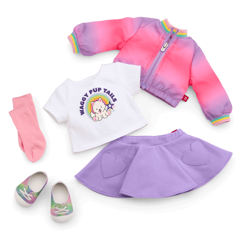 Summer starts her own dog-walking business, Waggy Pup Tails™. Summer’s sister designs a logo and prints it on a T-shirt, which Summer proudly wears at the business fair. This five-piece 18-inch doll outfit pairs with Summer’s™ Dog, Crescent™, and Summer's™ Dog Accessories (sold separately).