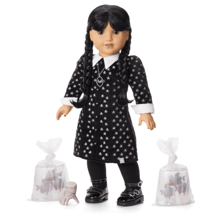 Curious, fiercely intelligent, and allergic to color, Wednesday Addams tackles life with courage and confidence. Celebrate this iconic character with the Wednesday Addams by American Girl® Collector Doll, featuring her signature look: long black pigtail braids, dark fingernails, and black velvet dress. By her side is the beloved member of the Addams clan and Wednesday’s closest confidant, Thing. But beware: she also travels with two bags of hungry piranhas. This limited-edition American Girl® 18-inch collector doll was designed in partnership with Amazon MGM Studios. No more than 6,000 Wednesday Addams by American Girl® Collector Dolls have been created worldwide.