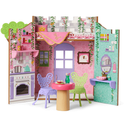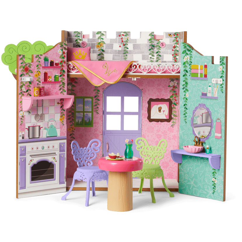When the WellieWishers want a place to relax and hang out, they head for the fantastical treehouse castle. There’s a front door to welcome friends and the back doors open wide to reveal a kitchen with a printed stove and a real shelf for storing food items on one side, plus a printed bathroom with a mirror and pink shell-shaped sink. There’s a sleeping loft and a cute little side door for pets. It also features: